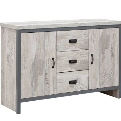 GFW Boston Sideboard Unit With 3 Storage Drawers & 2 Door Cabinets Adjustable shelves, Contemporary Grey Wooden Oak Sideboards For Living room, Kitchen, Bathroom, 113W x 39D 74.6H cm