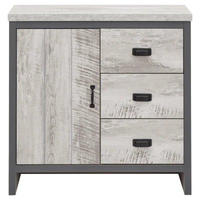 Bed KingsBOSTON MULTI UNIT GREY by GFW. Designed to look the part and made to last Ñ Give your home the design-led storage it deserves with this impressive, compact furnishing piece. The industrial styling with distressed finish incorporates both drawer and shelf options, while creating an urban look and feel that will enhance any living space. Press it into use for housing everyday dining accessories or as a chic repository for home office essentials. Incorporating a slender column of three drawers plus side cupboard with adjustable shelf. Complete with black metal handles and drawer pulls.. Crafted from particle board Finish: Paper Foil Colour: Grey Includes clear assembly instructions Product Details Dimensions: 76.2cm (H) x 77.8cm (W) x 35.3cm (D) Material: Particle Board Finish: Paper Foil Colour: Grey Assembly: Self-assembly, 21 steps Finish the look with pieces from our bedroom furniture. Explore more in living room furniture.
