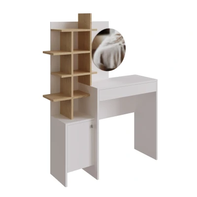 FREYJA DRESSING TABLE WHITE/OAK by GFW. Designed to look the part and made to last Ñ Introducing the GFW Freyja Dressing Table, a versatile and stylish addition to any space. This white Dressing Table features a round mirror, Oak finished shelves, a large sliding drawer and a two shelf cabinet; offering excellent storage options. It's adaptable design effortlessly compliments a variety of interior styles. Elevate your space with the Freyja Dressing Table's on trend style and generous storage offer.. Crafted from particle board, glass Finish: Melamine Colour: White, Oak Includes clear assembly instructions Product Details Dimensions: 151.5cm (H) x 113cm (W) x 35cm (D) Material: Particle Board, Glass Finish: Melamine Colour: White Secondary Colour: Oak Finish the look with pieces from our bedroom furniture. Explore more in living room furniture.