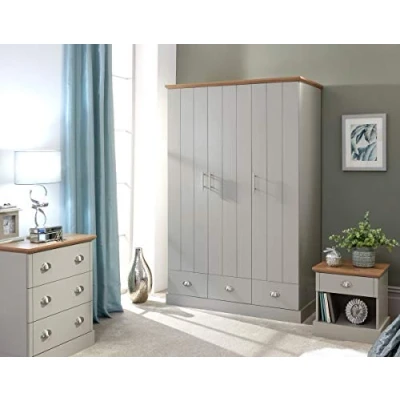 Kendal 4 Piece Bedroom Set includes a 3 door+ 3 drawer wardrobe, a 3 drawer chest and 2 x 1 drawer bedside cabinets If you’re in the market for a bedroom makeover, this classic four-piece furnishing set will get you off the mark. The stylish grouping includes a classic country-style three-door, three drawer wardrobe, a spacious three-drawer chest and a matching pair of handy bedside tables. Each quality piece is finished in soft grey with brushed steel handles and a bevelled oak-effect top. The smart way to add instant charm to a freshly decorated room. Dimensions: Kendal 3 Door 3 Drawer Wardrobe(D)578mm x (W)1156mm x (H)1800mm Dimensions: Kendal 3 Drawer Chest(D)396mm x (W)590mm x (H)712mm Dimensions: Kendal 1 Drawer Bedside(D)396mm x (W)450mm x (H)465mm Dimensions: Kendal 1 Drawer Bedside(D)396mm x (W)450mm x (H)465mm