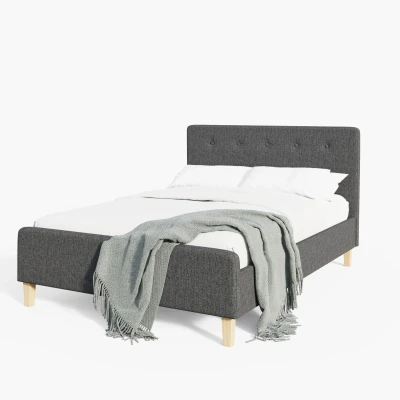 The perfect choice for a contemporary home, this retro-inspired bedframe personifies effortless chic. The simple padded frame is supported on pale wooden legs and covered with smart grey hopsack. A neat, buttoned headboard showcases restrained modern style. A great match for a no-fuss, minimalist setting and can be accessorised with colourful fabrics and linen to suit.