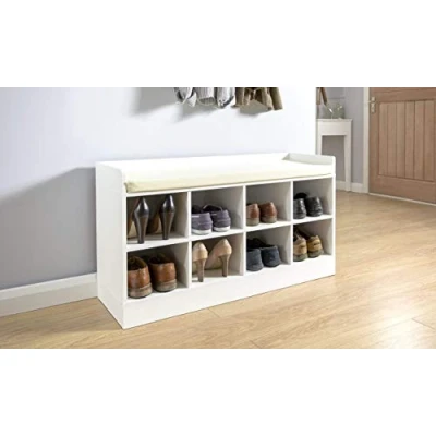 GFW Kempton, Shoe Storage Bench With Cushion, Contemporary Cabinet 8 Compartment For Hallway, Living Room, Wooden Bedroom Furniture, White, H 56cm x W 97cm D 34cm
