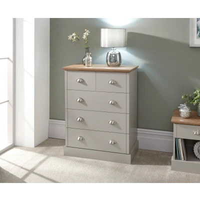 KENDAL 2 + 3 DRAWER CHEST by GFW. Designed to look the part and made to last Ñ If youÕre looking for a really practical bedroom storage solution thatÕs also a stylish furnishing piece, this drawer set is a superb choice. ThereÕs plenty of capacity Ð thanks to the array of five drawers, each featuring classic brushed steel cup handles. The country cottage feel is enhanced by the combination of sturdy construction, painted finish and bevelled oak-effect top Ð perfect for a boutique chic bedroom.. Crafted from particle board, mdf Finish: Paper Foil Colour: Grey, Beaufort Oak Includes clear assembly instructions Product Details Dimensions: 90.5cm (H) x 70cm (W) x 39.5cm (D) Material: Particle Board, MDF Finish: Paper Foil Colour: Grey Secondary Colour: Beaufort Oak Assembly: Self-assembly, 18 steps Finish the look with pieces from our drawers. Explore more in bedroom furniture.