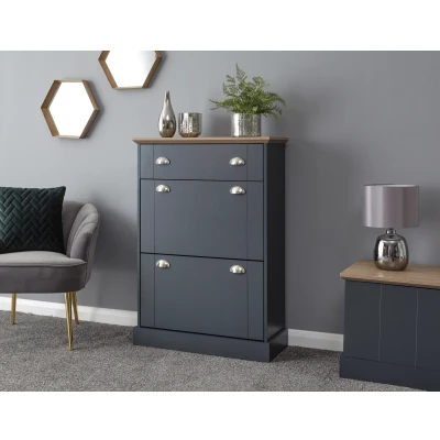 KENDAL DELUXE SHOE CABINET SLATE BLUE by GFW. Designed to look the part and made to last Ñ Make the smart choice with a shoe cabinet that fits perfectly into Kendals timeless country furnishing aesthetic. The elegant panels are finished in a choice of muted colours and complemented by brushed nickel cup handles that reflect the units classic look and feel. The full-width top drawer is perfect for gloves, pet paraphernalia and outdoor accessories, while the twin pull-down shoe compartments are each capable of accommodating up to six pairs of standard-size (UK10) mens shoes a dozen pairs in all. The chunky oak-effect top adds to the rustic charm and creates a handy surface for a lamp or ornament.. Crafted from particle board, mdf Finish: Paper Foil Colour: Slate Blue, Oak Includes clear assembly instructions Product Details Dimensions: 108.5cm (H) x 76.5cm (W) x 29cm (D) Material: Particle Board, MDF Finish: Paper Foil Colour: Slate Blue Secondary Colour: Oak Assembly: Self-assembly, 20 steps Finish the look with pieces from our bedroom furniture. Explore more in living room furniture.