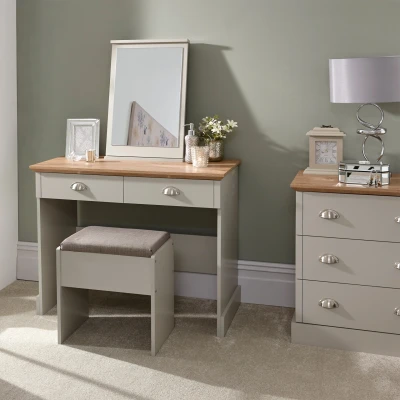 KENDAL DRESSING TABLE WITH STOOL GREY by GFW. Designed to look the part and made to last Ñ A versatile dressing table is always a smart choice for a bedroom, offering a handy repository for pots and potions and creating a one-stop station for hair and makeup. This cool Kendal set features a console-style table with integrated drawers and oak-effect top plus matching mirror and upholstered stool in soft grey. The stool tucks neatly away when not in use.. Crafted from particle board, mdf Finish: Paper Foil Colour: Grey, Beaufort Oak Includes clear assembly instructions Product Details Dimensions: 137cm (H) x 90cm (W) x 45cm (D) Material: Particle Board, MDF Finish: Paper Foil Colour: Grey Secondary Colour: Beaufort Oak Finish the look with pieces from our bedroom furniture. Explore more in living room furniture.