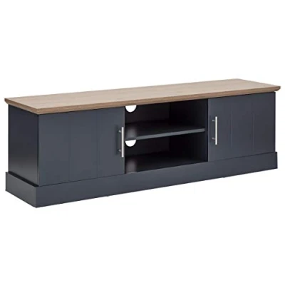 Bed KingsKENDAL LARGE TV UNIT SLATE BLUE by GFW. Designed to look the part and made to last Ñ Anyone who has a TV plus all the related tech Ð viewing boxes, gaming equipment and control boxes Ð is familiar with the ongoing problem of how to house it all without dominating the living space. Most will settle for a bland-but-practical TV unit, when Ð as this Kendal unit shows Ð itÕs not the only option. This large unit puts the chic into country, combining grooved panels, shelves and plinth in either slate blue or cool grey with a substantial oak-effect top thatÕs ideal for a larger TV. The central open shelving section is flanked by a pair of door-fronted units Ð ideal for viewing equipment, media and accessories.. Crafted from particle board Finish: Paper Foil Colour: Slate Blue, Oak Supports TVs up to 65Ó Includes clear assembly instructions Product Details Dimensions: 48cm (H) x 150cm (W) x 39cm (D) Material: Particle Board Finish: Paper Foil Colour: Slate Blue Secondary Colour: Oak Max TV Size: 65" Assembly: Self-assembly, 14 steps Finish the look with pieces from our tv units. Explore more in living room furniture.