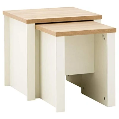 Bed KingsLANCASTER NESTING TABLES CREAM by GFW. Designed to look the part and made to last Ñ A classic nest of tables reinvented for a new generation. The Lancaster range is popular because the smart combination of painted frame and oak-effect top makes it a good fit for both period and contemporary interiors. Take this versatile duo Ð a pair of handy occasional tables that offer plenty of options when guests arrive but can be stacked neatly together to save space when not in use. A choice of grey, cream or slate blue finishes to suit most colour schemes. A great addition to any living space.. Crafted from particle board Finish: Paper Foil Colour: Cream, Oak Includes clear assembly instructions Product Details Dimensions: 49cm (H) x 50cm (W) x 44.5cm (D) Material: Particle Board Finish: Paper Foil Colour: Cream Secondary Colour: Oak Assembly: Self-assembly, 16 steps Finish the look with pieces from our bedroom furniture. Explore more in living room furniture.
