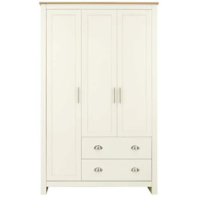 GFW Lancaster 3 Door Bedroom Wardrobe With Hanging Rails & 2 Storage Drawers, Country Cottage Styling Contrast Oak Top. Cream (D180cm x W112cm D52cm)