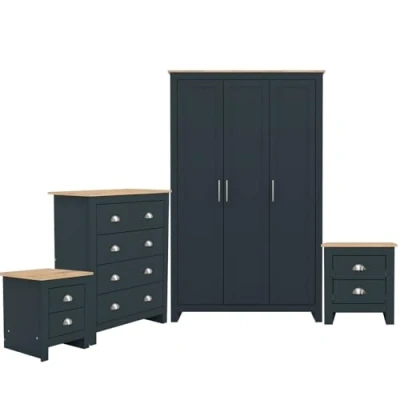 The Lancaster Bedroom Suite 4 piece set includes: 3 door wardrobe (x1) 4 drawer chest (x1) 2 drawer bedside cabinet (x2) Its easy to create a bedroom that showcases effortless chic, with this stylish four-piece furnishing suite. The design of this stunning collection exudes understated luxury. Comprising a three-door wardrobe, four-drawer chest and pair of very chic bedside cabinets, each piece is finished in cream, slate blue or grey foil with an oak top and brushed steel handles. An elegant suite, in a choice of 3 modern colours, incorporating storage and hanging space, creating a fresh, furnished new furniture suite suitable for a double room. Order now as we have very limited Lancaster Suite sets remaining SPECIFICATIONS 3 door wardrobe (W)1118 x (D)520 x (H)1800mm 4 drawer chest (W)790 x (D)395 x (H)950mm 2 drawer bed side cabinet (W)450 x (D)395 x (H)482mm