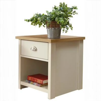 LANCASTER LAMP TABLE CREAM by GFW. Designed to look the part and made to last Ñ This charming lamp table will bring contemporary styling to any home. Features include a handy drawer with a satin silver handle and a useful storage shelf underneath. Its matt grey finish and oak veneered top matches perfectly with the rest of the Lancaster range and would be at home in any living or dining room.. Crafted from particle board Finish: Paper Foil Colour: Cream, Oak Includes clear assembly instructions Product Details Dimensions: 50cm (H) x 45cm (W) x 45cm (D) Material: Particle Board Finish: Paper Foil Colour: Cream Secondary Colour: Oak Finish the look with pieces from our bedside cabinets. Explore more in bedroom furniture.