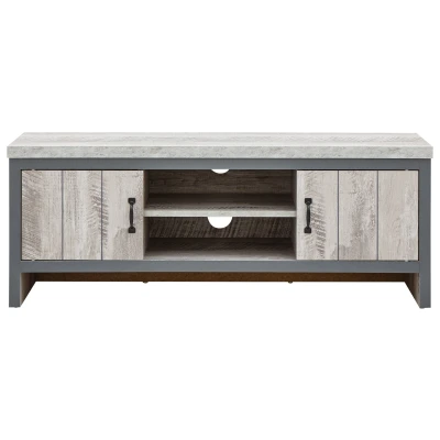 BOSTON 2 DOOR TV UNIT GREY by GFW. Designed to look the part and made to last Ñ Even if you have only the most basic TV tech Ð TV screen plus viewing box or DVD player Ð you need somewhere to put it. If youÕd prefer that your furnishings reflected an industrial aesthetic, this TV unit from the Boston range is the perfect choice. The unitÕs neat construction pairs a central open shelving section with a pair of magnetic door-fronted cupboards in a chunky format that screams urban chic. The 30mm top panel is complemented by a thick frame in contrasting dark grey. Ideal for an understated interior.. Crafted from particle board Finish: Paper Foil Colour: Grey Supports TVs up to 50Ó Includes clear assembly instructions Product Details Dimensions: 43cm (H) x 113cm (W) x 39.2cm (D) Material: Particle Board Finish: Paper Foil Colour: Grey Max TV Size: 50" Assembly: Self-assembly, 13 steps Finish the look with pieces from our tv units. Explore more in living room furniture.