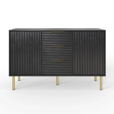 NERVATA SIDEBOARD BLACK by GFW. Designed to look the part and made to last Ñ Discover the allure of our Nervata Sideboard, a functional masterpiece that combines elegance and storage. The wooden panels, enhanced with wood grain texture, create a sense of luxury and sophistication. With its captivating gold accents and sleek black design, the Nervata Sideboard is a statement piece that adds a touch of opulence to your dining or living area. In the Nervata Range, every piece is thoughtfully designed to offer a unique and exceptional experience. Whether it's the coffee table, lamp table, sideboard, or TV unit, each one represents the perfect blend of elegance and functionality, allowing you to create a home that is truly a masterpiece.. Crafted from particle board, mdf Finish: Paper Foil Colour: Black, Gold Includes clear assembly instructions Product Details Dimensions: 72.5cm (H) x 116cm (W) x 39cm (D) Material: Particle Board, MDF Finish: Paper Foil Colour: Black Secondary Colour: Gold Assembly: Self-assembly, 19 steps Finish the look with pieces from our bedroom furniture. Explore more in living room furniture.