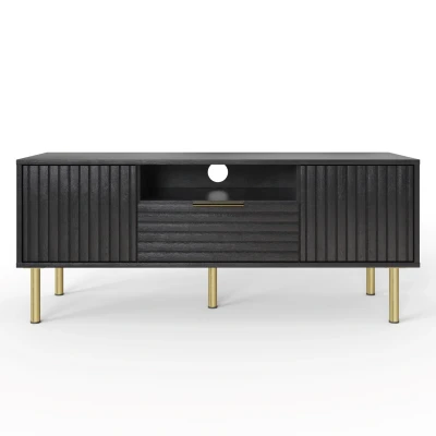 NERVATA TV UNIT BLACK by GFW. Designed to look the part and made to last Ñ Transform your entertainment space with our Nervata TV Unit. The sleek black and gold color scheme, reminiscent of art deco styling, brings a touch of glamour to your home. The realistic wood grain texture and dimpled foil create a visually stunning focal point, while the integrated recesses add dynamic energy to your surroundings. Experience the perfect blend of style and functionality as you enjoy your favorite movies and shows in style. In the Nervata Range, every piece is thoughtfully designed to offer a unique and exceptional experience. Whether it's the coffee table, lamp table, sideboard, or TV unit, each one represents the perfect blend of elegance and functionality, allowing you to create a home that is truly a masterpiece.. Crafted from particle board, mdf Finish: Paper Foil Colour: Black, Gold Includes clear assembly instructions Product Details Dimensions: 49cm (H) x 119.5cm (W) x 39cm (D) Material: Particle Board, MDF Finish: Paper Foil Colour: Black Secondary Colour: Gold Assembly: Self-assembly, 17 steps Finish the look with pieces from our tv units. Explore more in living room furniture.