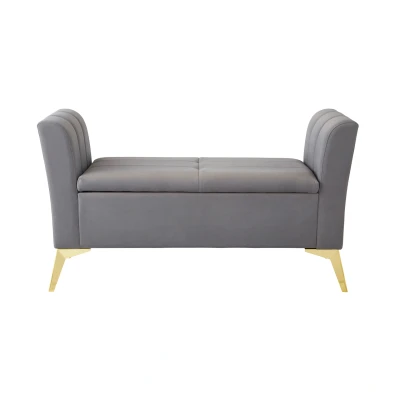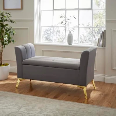 PETTINE OTTOMAN STORAGE BENCH GREY by GFW. Designed to look the part and made to last Ñ The Pettine Ottoman Storage Bench adds a timeless touch to any living space. It features flared arms with a classic sculpted design and a generously cushioned seat that lifts to reveal a spacious, fabric-lined storage compartment perfect for storing blankets and throws. Upholstered in soft plush fabric and finished with sleek golden tapered legs, it offers a striking contrast that completes the elegant look.. Crafted from mdf, solid chinese wood, plywood Finish: Upholstered Colour: Grey, Gold Includes clear assembly instructions Product Details Dimensions: 67cm (H) x 121cm (W) x 45.5cm (D) Material: MDF, Solid Chinese Wood, Plywood Finish: Upholstered Colour: Grey Secondary Colour: Gold Assembly: Self-assembly, 5 steps Finish the look with pieces from our bedroom furniture. Explore more in living room furniture.