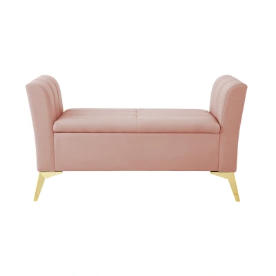 PETTINE OTTOMAN STORAGE BENCH BLUSH PINK by GFW. Designed to look the part and made to last Ñ The Pettine Ottoman Storage Bench adds a timeless touch to any living space. It features flared arms with a classic sculpted design and a generously cushioned seat that lifts to reveal a spacious, fabric-lined storage compartment perfect for storing blankets and throws. Upholstered in soft plush fabric and finished with sleek golden tapered legs, it offers a striking contrast that completes the elegant look. Crafted from mdf, solid chinese wood, plywood Finish: Upholstered Colour: Blush Pink, Gold Includes clear assembly instructions Product Details Dimensions: 67cm (H) x 121cm (W) x 45.5cm (D) Material: MDF, Solid Chinese Wood, Plywood Finish: Upholstered Colour: Blush Pink Secondary Colour: Gold Assembly: Self-assembly, 5 steps Finish the look with pieces from our bedroom furniture. Explore more in living room furniture.