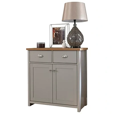 LANCASTER COMPACT SIDEBOARD GREY by GFW. Designed to look the part and made to last Ñ An elegant storage solution for the living or dining room. The Lancaster compact sideboard with its matt grey finish and oak veneered top matches perfectly with the rest of the Lancaster range and features two handy drawers with satin silver handles and a spacious double door cupboard underneath fitted with satin silver knobs.. Crafted from particle board Finish: Paper Foil Colour: Grey, Oak Includes clear assembly instructions Product Details Dimensions: 81cm (H) x 79cm (W) x 35cm (D) Material: Particle Board Finish: Paper Foil Colour: Grey Secondary Colour: Oak Finish the look with pieces from our bedroom furniture. Explore more in living room furniture.