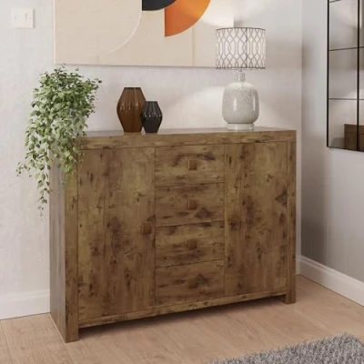 JAKARTA LARGE SIDEBOARD MANGO by GFW. Designed to look the part and made to last Ñ Add elegance with the Jakarta Large Sideboard. Distressed tropical hardwood look, versatile storage, classic design and a perfect blend of style and practicality.. Crafted from hollowcore, particle board Finish: Melamine Colour: Mango Includes clear assembly instructions Product Details Dimensions: 82cm (H) x 108cm (W) x 35cm (D) Material: Hollowcore, Particle Board Finish: Melamine Colour: Mango Finish the look with pieces from our bedroom furniture. Explore more in living room furniture.