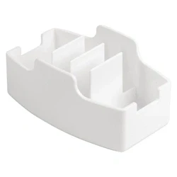 60(H) x 120(W) x 75(D)mm. Plastic. White. Keeps your sachets neat and tidy. Rubberised feet prevent slipping. Durable design for long-lasting use. White finish suits any décor. Ideal for counters, hotel rooms, table tops and self-serve drinks stations.