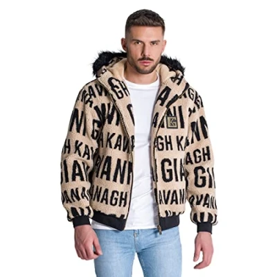 Casual Cut, printed style, GK logo made of black alloy, Textured and Warm sherpa lettering, GK metal plate, hooded, faux fur, top collar, zip front, lined pockets; interior filling, fully lined