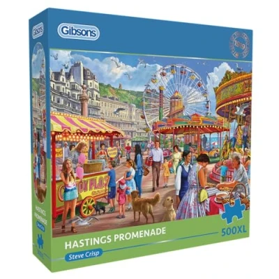 DESIGN AND THEME: Enjoy a stroll along the coast with this nostalgic seaside puzzle by Steve Crisp. Featuring Hastings Promenade with its carousel, colourful townhouses, and the rolling Sussex hills, this charming scene captures the joy of a classic British day out. LARGER PIECES FOR EASIER HANDLING: This 500XL piece puzzle features extra-large pieces - twice the size of standard puzzle pieces - making it perfect for those who prefer a more comfortable puzzling experience or have limited dexterity. QUALITY AND CRAFTSMANSHIP: Made from the thickest 100% recycled puzzle board for a precise fit and premium finish. Printed with vegetable-based inks and a non-glare surface for lasting enjoyment. Includes a handy poster to reference as you build. GIFTING AND PRESENTATION: Measuring 68 x 49 cm when complete and presented in a 24 x 24 x 6 cm box, this puzzle makes a thoughtful and accessible gift for adults, families, and grandparents who love seaside nostalgia. HERITAGE AND SUSTAINABILITY: Gibsons is a family-run British company established in 1919, proud recipient of The King’s Award for Sustainable Development and certified B Corp. We’re dedicated to crafting puzzles that are beautiful, inclusive, and kind to the planet., Manufacturer: Gibsons