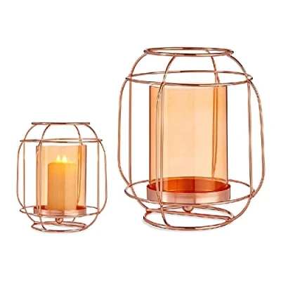 ManoManoMetal and amber glass candle holder in copper color, dimensions 19x20x19 cm. Designed like a lantern, it accommodates a candle inside, adding a contemporary decorative touch to your interior.