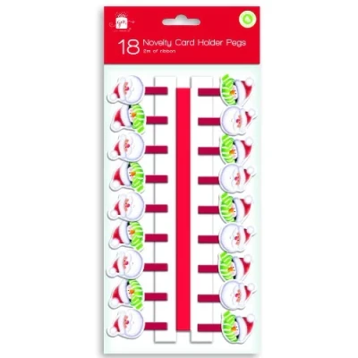 Hang your Christmas cards in pride of place with this novelty Christmas cardholder. With pegs that feature an adorable penguin in a Christmas hat and stripy green scarf, or merry Santa Claus faces. Made for displaying all your lovely Christmas cards for the festive season!. 1 x Novelty Christmas Card Holder 18 Pegs. 18 card pegs. Assorted designs of Santa Clauses and festive penguins