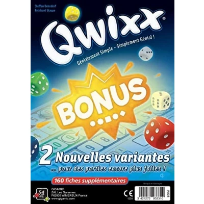 Qwixx Bonus, bring two new sheet blocks and two new ways to score points. Block A introduces a sequel of Color Bonuses, and Block B, various bonuses. The game contains two new sheet blocks, the A and the B. 2 - 5 players 8+, Manufacturer: gigamic