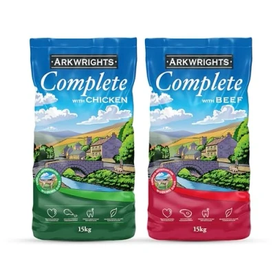 TASTY BEEF & CHICKEN DRY FOOD — Arkwrights Complete with Beef and Complete with Chicken provide balanced nutrition and plenty of energy for working and sporting adult dogs, with a plenty of flavour that'll have them licking the bowl clean COMPLETE NUTRITION — we use only the finest ingredients in a nutritious formula that contains 18% protein, 7% fat and wholegrain cereals for slow energy release — no artificial colours, flavours or sugars PACKED WITH BENEFICIAL INGREDIENTS — our balanced formula contains crunchy kibble to help keep teeth clean, antioxidants for a healthy immune system, and vitamins A, D3 and E FEEDING GUIDE — serve dry or with water or gravy as preferred. When feeding for the first time, introduce the food gradually over a few days, adjusting the amount based on your dog’s condition and activity. See pack for full details UK MADE FOR OVER 150 YEARS — we’ve been creating premium dog food blends in the UK with the finest-quality UK-sourced ingredients since 1873, helping to enhance the health and happiness of your dog