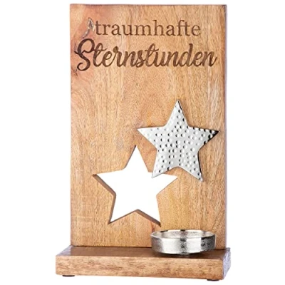 GILDE Decorative Candle Holder Tea Light Star with Lettering: Dreamlike Hours Christmas Decoration Made of Wood Colour Brown Silver Height 32 cm