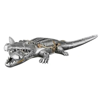 The Steampunk crocodile resin figurine impresses with its silver finish with gold accents and an elegant antique finish. This "Steampunk Crocodile" crocodile figure measures 14.5 cm high, 35.5 cm wide and 60 cm deep, ideal for steampunk and crocodile lovers. The figurine's resin material provides durability and stability, while the antique finish gives a unique vintage look. Weighing in at 2.61 kg, the "Steampunk crocodile" figure is sturdy and sturdy, perfect as an eye-catching decorative piece in any room. The combination of silver and gold design makes the figure a stylish highlight in any steampunk collection.