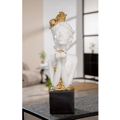 Elegant sculpture in white resin with gold and black accents depicting a woman motif with roses. Perfect for stylish living spaces. Stable on a 10 x 12 cm base with felt pads to protect surfaces and allow for easy movement. Measuring 42cm tall and 14cm wide, this sculpture is a striking focal point in any room. Ideal as a gift for art lovers or to brighten up your living room, office or bedroom. The combination of woman motif and roses gives any room a romantic and elegant atmosphere.
