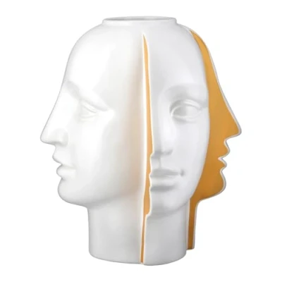 ELEGANT CERAMIC FACE SHAPED VASE This white vase with gold accents adds a stylish touch to any room and is a real focal point. 3D APPEARANCE FOR MODERN AESTHETICS The unique 3D face shape provides a fascinating visual experience and fits perfectly with contemporary home styles. WATERPROOF AND FUNCTIONAL Ideal for fresh flowers or as a decorative element, this vase is both practical and aesthetically pleasing. PERFECT SIZE FOR VERSATILE PLACEMENT At 28cm high and 23cm diameter, the vase is suitable for tables, shelves or window sills. HIGH QUALITY CRAFTSMANSHIP The sturdy ceramic ensures durability and stability, while the smooth surface is easy to clean.