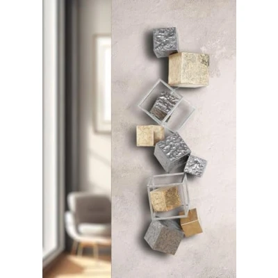 The wall relief cubes made of metal impress with its anthracite and gold tones, complemented by silver accents for a modern design. The hammered and roughened surface of the cube wall relief gives it a unique metallic look that will be a highlight in any room. At 36.25 inches high, 11.75 inches wide and depth of 7.5 inches, the Wall Relief Cubes is an impressive piece of art for your wall decor. Thanks to the integrated suspension, the Cubes wall relief can be easily and securely attached to any wall for instant style. The combination of anthracite, gold and silver elements makes the Cubes wall relief a versatile decorative piece for modern interiors.