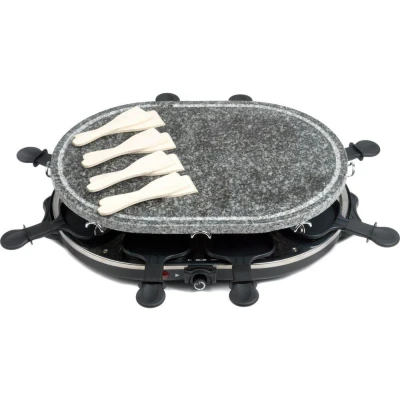 - This Giles & Posner raclette grill serves up to 8 people - perfect for parties and family dinners- Raclette lets you create delicious cheesy melts, while the grill plates are perfect for meat, fish and vegetables - It includes 8 raclette pans and wooden spoons, so you can have fun cooking together at the table - With its temperature dial you can easily adjust the heat so it's just right - Its non-stick coating makes it easy to clean the grill and pans when you're done