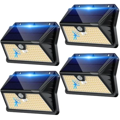 【High-Brightness & Smart Security Lighting】- Solar Lights features 185 ultra-bright LEDs with up to 150 lumens, 3000K LED lighting over 30㎡. The built-in motion sensor turns on the light when people or animals approach, enhancing security at night 【High-Efficiency Solar Panel & Eco-Friendly】- Solar fence lights uses an upgraded polycrystalline solar panel with 22% conversion efficiency. It charges quickly during the day and lasts over 3 years. No wiring—just sustainable lighting powered by the sun 【Motion Sensor & 3 Lighting Modes】- Mode A: Stays on dim all night and brightens for 20s when motion is detected. Mode B: Turns on for 20s only when motion is detected. Mode C: Automatically turns on at night and off during the day.Sensing angle: 120°, range: 3–5m 【IP65 Waterproof & High Quality】- Solar fence lights made of durable ABS with sealed waterproof silicone rings. Rated IP65 for water, dust, sun, and frost resistance. Designed for stable outdoor use in balconies, stairs, patios and more, even in bad weather 【Wire-Free Easy Installation】- Security light mount with included screws. Installation height: 3–5m. Just place the solar panel in a sunny location for optimal charging. Includes 4 solar lights, 8 sets of screws, 1 manual, and 24/7 customer support