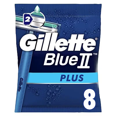 Gillette BlueII Plus Men's Disposable Razors (8 Counts) feature two durable chromium-coated blades and a water-activated Lubrastrip for a smoother, more comfortable shave with less razor burn. The easy grip handle ensures precise control, and each razor is designed for extended use.