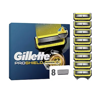 The Gillette Proshield Power Razor Blades Refill (8pk) offers 5 ultra-sharp blades with dual lubrication strips for a smooth, comfortable shave and a precision trimmer for detailing. Compatible with all 5-blade handles, each refill lasts up to 20 shaves, ensuring efficiency and cost-effectiveness.
