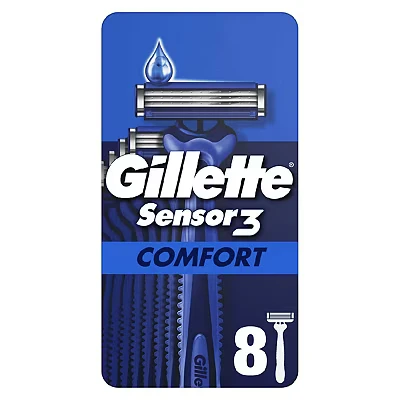 The Gillette Sensor3 Comfort disposable razor offers up to 12 smooth shaves with its 3-blade design, Lubrastrip technology, and flexible head for better contour adaptation. Its ergonomic grip and ComfortGel‚Ñ¢ ensure a close, comfortable shave with minimal irritation.