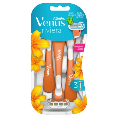 Venus Riviera Disposable Razors (pack of 3) offer a smooth, close shave with 3 blades, avocado oil-infused strips for skin protection, and a pivoting head for contour adaptability. Scented with melon and featuring a soft-grip handle, it ensures comfort and a refreshing shaving experience.