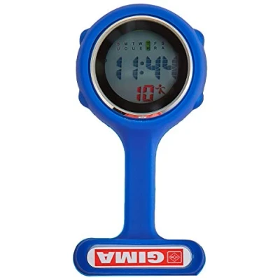Silicone nurse watch provided with a safety pin. Round dial. Blue Colour. Suitable to measure patient pulse, beat and sterilization procedure timing. Conforming to procedures not allowing nurses to wear wrist watches. Digital Manual: English, French, Italian, Spanish.