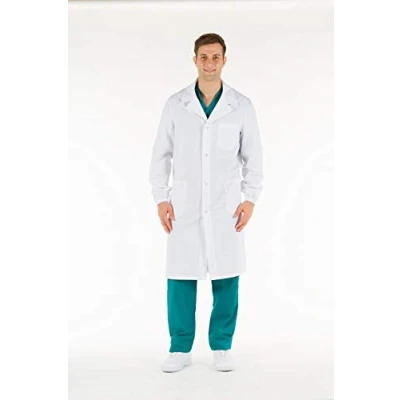 Unisex white lab coat doctor's work wear long sleeve with elasticated cuffs front closure with 4 press buttons 2 hip patch pockets + 1 chest pocket on the left side rear martingale stitched for length overlapping rear slit Made in Italy 100% High Quality Cotton 190 g/m2 CE product Conform to 89/686/CEE EU Size 58 USA Size XXL France Size 54 Other sizes and models (Men's and Womens) are available