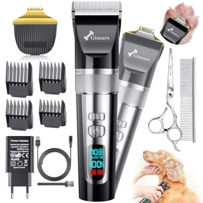 【4-in-1 Professional Gimars Clipper with Small Trimmer Blade】 Gimars Clipper features two blades: a standard 33-tooth wide blade for thick body coats and a narrow trimmer blade for delicate areas such as paws, rump, face, ears, nose, tail, and beard. This all-in-one grooming tool includes everything needed for pet grooming. The two blades are easily interchangeable with a simple press. (Please refer to video tutorial.) 【Upgraded Motor for Thick-Coated Dogs】 Gimars Clipper features an upgraded powerful motor with 4 adjustable speeds (5500 RPM/6000 RPM/6500 RPM/7000 RPM), effortlessly trimming hair without pulling, ensuring a smooth grooming. The high-speed power mode quickly handles thick, long, and curly coats, saving you time. The low-speed, low-vibration mode is perfect for sensitive areas and nervous pets. Suitable for various hair types, ideal for grooming dogs, cats, rabbits, sheep, and horses. 【Upgraded Ceramic and Titanium Blades: Safe and Sharp】 Gimars Clipper is equipped with 33-tooth titanium alloy fixed blades and movable ceramic blades, ensuring safe and precise trimming with low friction to prevent skin hurt. Compared to traditional 24 or 26-tooth blades, Gimars Clipper blade is smoother, sharper, and more effective at cutting through thick, matted hair. The ceramic blade is durable, rust-resistant, and long-lasting. The detachable IPX7 waterproof blade design makes cleaning and maintenance easy. (Note: Do not immerse the entire device in water.) 【Low Noise ≤55dB, Low Vibration】 Gimars Clipper operates at a noise level below 55dB with a low-vibration motor, reducing stress and keeping your pet calm and relaxed during grooming. With simple one-button operation, you can easily change pet hair styles at home. Save time and money while keeping your furry friend looking great! 【2-Hour Fast Charge & Cordless Operation】 Rechargeable Gimars Clipper charges fully in just 2 hours with the included EU adapter and USB cable, compatible with various charging options. Gimars Clipper can be used continuously for 120 minutes, sufficient to groom large dogs or horses. Cordless design prevents tangling and the risk of pets biting the cord, suitable for indoor and outdoor use. An LCD screen displays battery life and charging status. Gimars Clipper also supports wired operation.