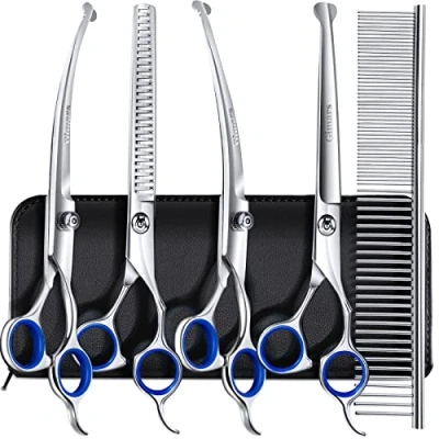 【Professional Dog & Cat Grooming Essential Tool for Groomers】Gimars dog grooming scissors are made of 4CR stainless steel materials, dipped in a ceramic coating and suffer 60 process carefully polishing and grinding, which makes blades will not rust, cleaned easily and keep the blades sharp for a longer time than stainless steel without this sheath 【Sharp Convex Edge & Safety Round Tip】The sharp convex edge makes the cutting of these dog grooming scissors professional and more smooth and stable, great for eliminating hair mats and tangles. Safety round tip keeps pets safe no Injured facial, not scare the pets 【Ergonomically Designed for Holding Comfortably】We also know how tiresome grooming can be, so we made the handles ergonomically designed to fit comfortably in your hands and your hands don't get tired and sore while using the scissors 【6 in 1 Dog Grooming Scissors Set】The dog grooming scissors set comes with 2 straight scissors, 1 thinning scissor, 1 curved scissor, 1 grooming comb and 1 storage case 【Professional After-sale Service】We are professional pet product manufacturers and confident in the quality of the products, so we provide 3 months unconditional return. If you are not satisfied with our products, you can contact us anytime and we will provide the most professional after-sales service