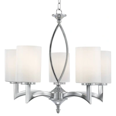 The range has a very modern design which makes it the ideal choice for any contemporary style room. The opal glass shades give the fitting an extra dimension, hiding the lamp while allowing the light to shine through. The chrome finish gives the fitting a clean feel. The collection offers the perfect fittings for a dining room or living room area. This five light ceiling light is also available as a matching wall light .
