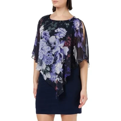 This Gina Bacconi dress features a beautiful dark floral chiffon cape overtop with a fitting stretch jersey dress. A perfect addition to your wardrobe.