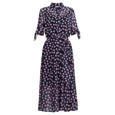 Our new spot shirt dress is the perfect work to weekend style. This style comes in a fabulous pink and green spot on a black base, it features a full button down front and self-fabric tie belt. The short sleeves tie with a knot for a fresh look. Dress up or down with trainers or heels! This style has a jersey slip dress style lining. It measures 128cm from shoulder point to hem.