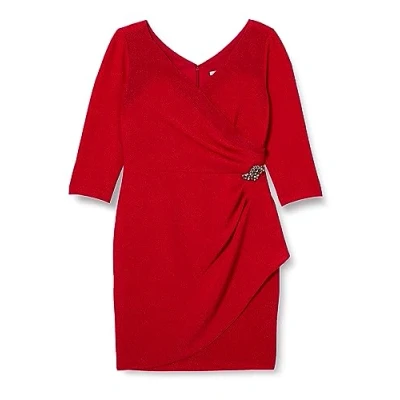 Gina Bacconi Short Shift Dress with Surplice Neckline, Cascade Ruffle Skirt and Embellishment at Hip, Red, 20