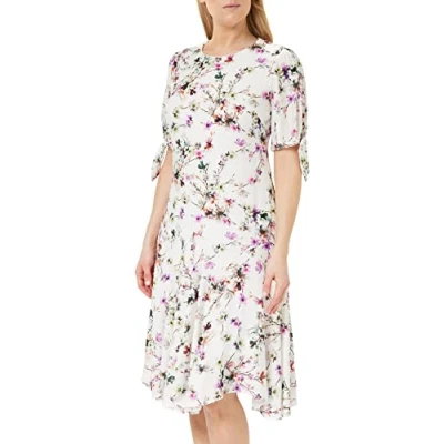 Feel classy in this elegant floral dress by Gina Bacconi. A sophisticated dress constructed from a viscose dobby jacquard, this dress is perfect for a party or special occasion. A flared hem with godet detailing for a flattering silhouette. With a round neck and short sleeves with tie detailing. This dress is fastened with a concealed zip.