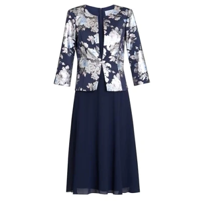 Strike a pose in this Sandra floral print 2-piece dress and jacket. The dress comes just below the knee, with a sheer overlay creating a graceful look. The dress is sleeveless, with a fitted bodice that complements the flared skirt. The matching jacket is crafted with a floral jacquard material in navy and silver tones, adding a touch of glamour. This dress and jacket is perfect for any special occasion.