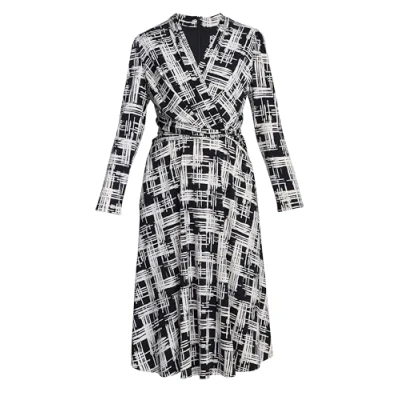 Effortlessly chic, made from soft fabric, this dress features a flattering wrap silhouette, long sleeves, and a self-tie belt that cinches the waist. The black and white abstract print is interesting, while the midi length offers versatility. Prefect for both workdays and weekend outings.